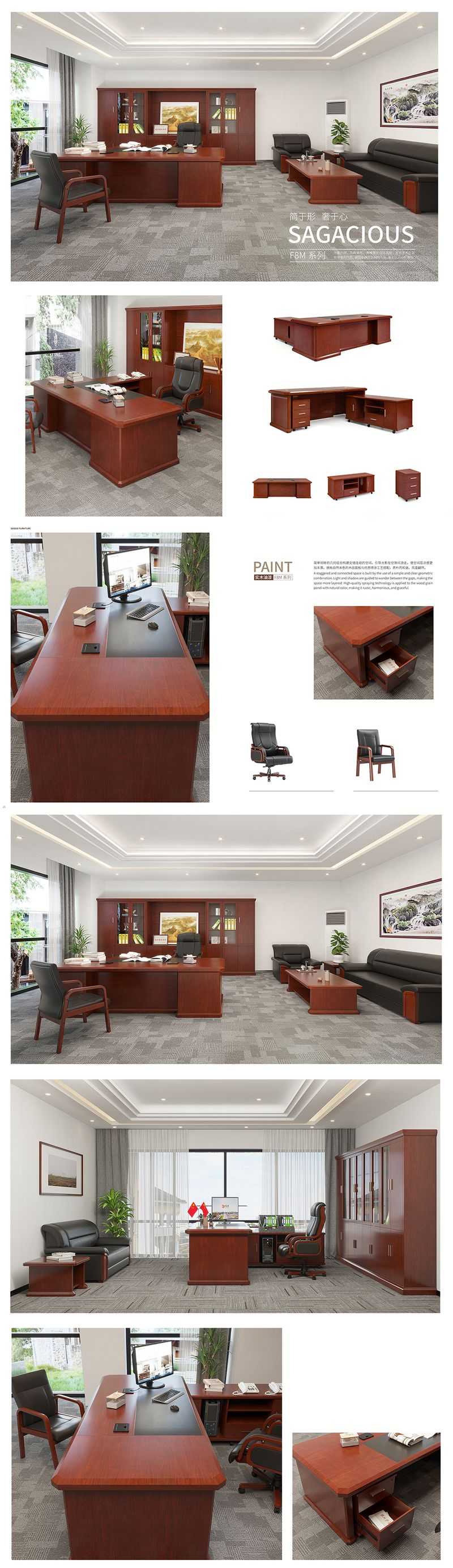 材質(zhì):基材:采用“福人”牌E0級中密度纖維板;進口天然木皮,厚度0.6mm;油漆:采用進口德國“易涂寶”油漆。臺面含1個HS020線蓋,1個HS020多媒體線盒(其模塊為:1個電源三插模塊、1個15芯電腦插(孔式)模塊、1個網(wǎng)絡(luò)模塊、1個電話模塊)臺面含中抽,皮板,優(yōu)質(zhì)正面鎖、導(dǎo)軌、緩沖門鉸、五金拉手,班臺左右互換。主臺配:活動副柜:1570W*520D*655H、活動小柜:420W*520D*655H油漆工藝+環(huán)保免漆板